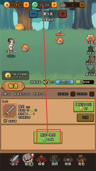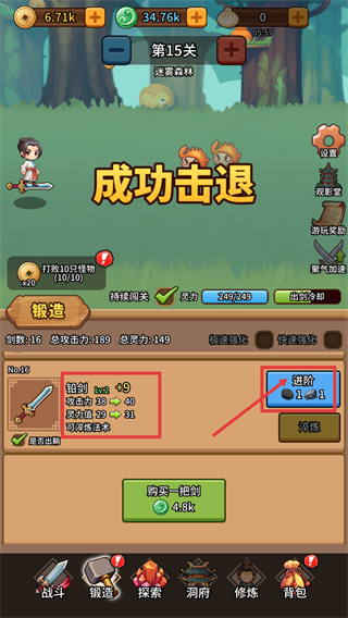 1、【锻造】界面中,消耗【3.4k-绿色货币】点击【购买一把剑】可新增武器,提升【总攻击力】与【总灵力】以增强战力。
