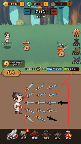 2、【第11关-迷雾森林】战斗时,可操控多把剑的攻击队列,合理排布剑的位置能提升对怪物的输出效率。