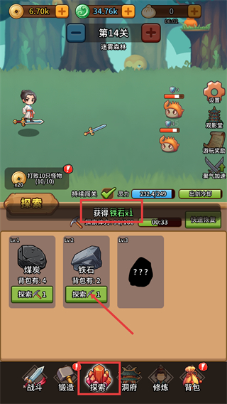 3、进入【探索】界面,选择【铁石】对应的探索按钮,可获得【铁石-x1】,这类材料是武器进阶的关键资源。