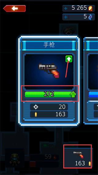 1、查看【手枪】界面时,关注其【2/2】进度条,进度满后可解锁对应功能,同时右侧显示的【163-弹药】是战斗核心资源。
