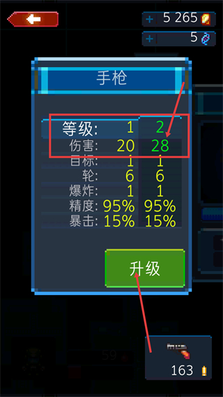 2、点击【升级】按钮可提升【手枪】等级,等级从1升至2后,【伤害】会从20提升至28,增强武器输出能力。
