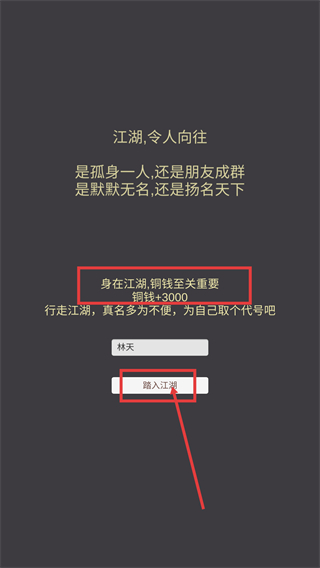 1、输入代号后点击【踏入江湖】,可获得初始【铜钱+3000】,铜钱是江湖中核心资源,用于后续养成操作。