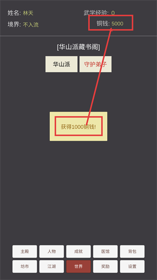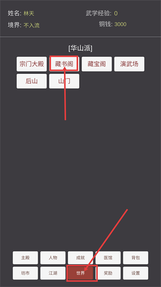2、进入【华山派】界面后,点击【藏书阁】可解锁对应功能,同时通过底部【世界】按钮可切换场景。