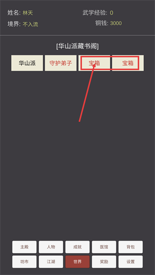 3、在【华山派藏书阁】中,点击【宝箱】可获取资源,这是初期积累物资的便捷方式。