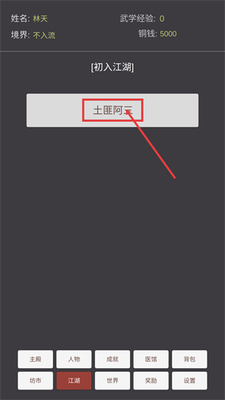 1、点击【江湖】按钮进入【江湖游历】界面,选择【初入江湖-(推荐境界:不入流)】,匹配自身当前境界开启游历。