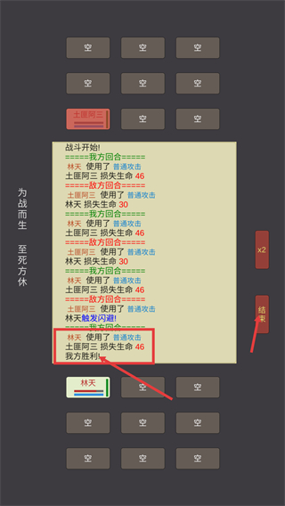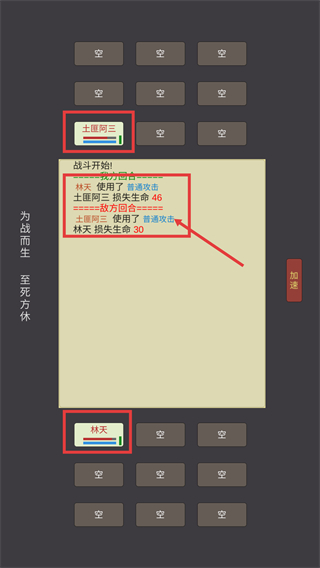 3、与【土匪阿三】战斗时,我方回合使用【普通攻击】造成46点伤害,敌方回合会受到30点生命损失,需关注自身血量。