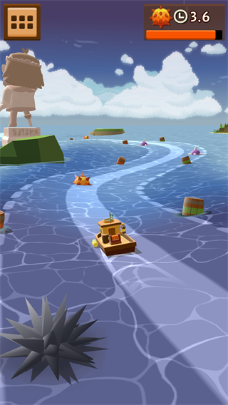 3、航行过程中,需操控船只沿安全航线移动,避开水域中的尖刺、浮桶等危险障碍物,持续推进航程。