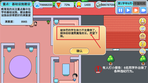 4、体罚学生时需注意体力阈值,若学生体力不支晕倒,会触发【声望下降】的负面事件,需合理控制处罚程度。