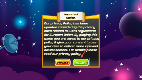 1、接受隐私政策:在游戏启动时,阅读并接受隐私政策,点击“ACCEPT”以同意条款并继续。