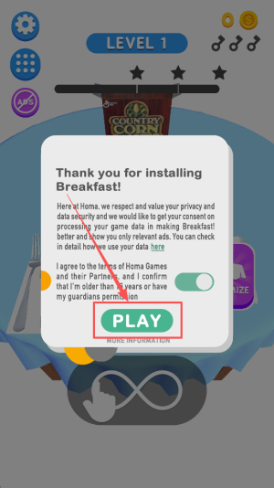 1、进入游戏:首先打开游戏主界面,阅读隐私条款后勾选“I agree”并点击“PLAY”进入。