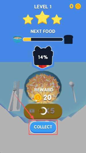 4、领取奖励:出现“NEXT FOOD 14%”与“REWARD”界面,点击“COLLECT”收取金币与星星。