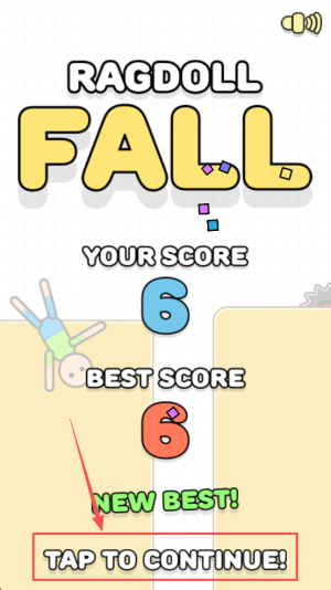 4、查看成绩:落地后显示“YOUR SCORE 6”与“NEW BEST!”,点击“TAP TO CONTINUE!”返回主界面。