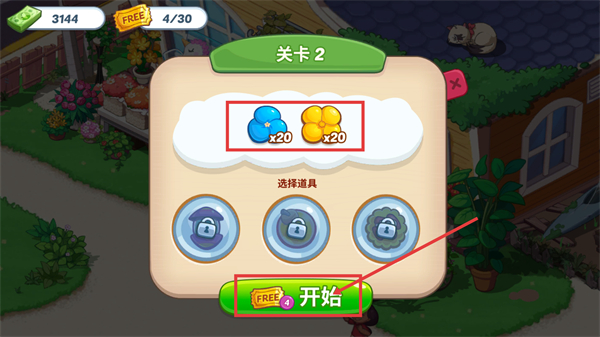 1、进入【关卡2】需达成【蓝色花-x20】和【黄色花-x20】的消除目标,道具暂未解锁,点击带【FREE】标识的【开始】按钮进入关卡。