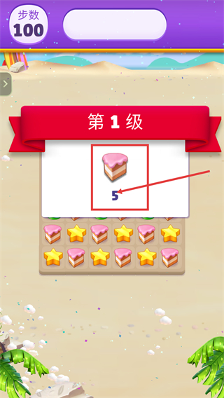 2、进入【第1级】,当前【步数-100】,需消除【蛋糕-5】个,优先连接界面中的蛋糕元素,推进关卡进度。