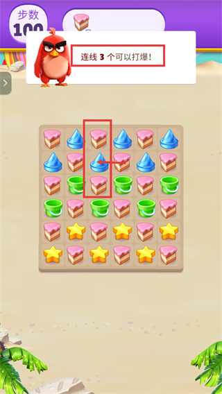 3、根据提示【连线3个可以打爆!】,按红色框指引连接同元素,借助该规则高效消除目标物品,节省步数。