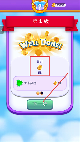4、【第1级】通关后显示【WELLDONE!】,获得【合计-58-金币】奖励,点击【下一步】按钮可进入下一个关卡。