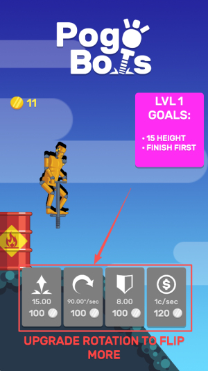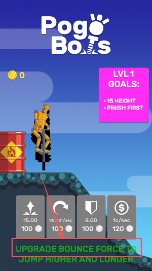 1、进入游戏:点击“Pogy BoTS LVL1”进入关卡,查看“15 HEIGHT·FINISH FIRST”目标。