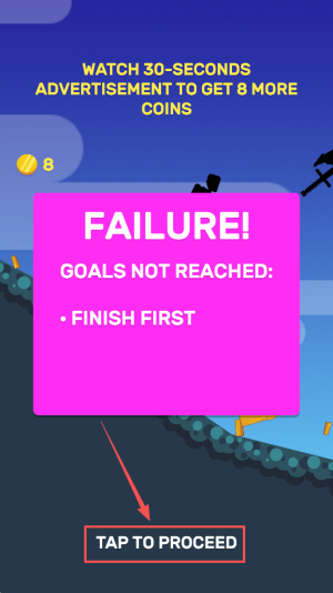 3、挑战失败:未达到目标高度与名次,出现“FAILURE!”提示,点击“TAP TO PROCEED”继续。