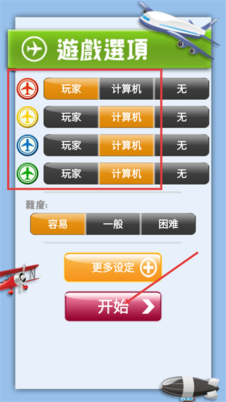 1、在【遊戲選項】界面,确认玩家-计算机的阵营设置与【容易】難度后,点击【開始】按钮进入【飛行棋大戰】的对局。