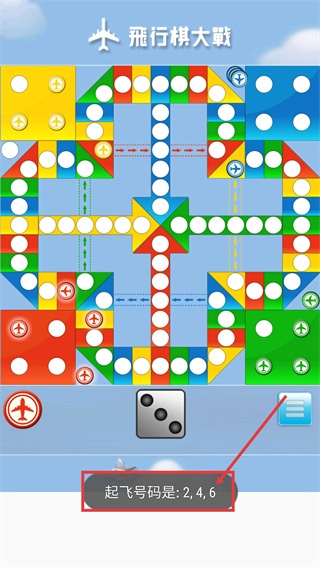 2、进入【飛行棋大戰】后,留意提示【起飞号码是:2,4,6】,需掷出对应点数才能让己方飞机从基地起飞。
