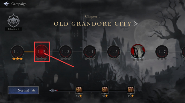 1、在【Campaign】界面的【Chapter-1】-【OLD-GRANDORE-CITY】中选择【1-2】关卡,完成后积累星级可解锁对应【宝箱】奖励。