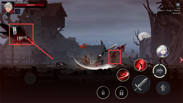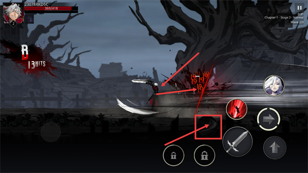 3、当积累到【13HITS】连击时,点击界面的【技能按钮】释放范围技能,可对多名敌人造成高额输出。