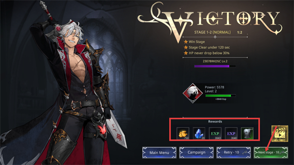 4、通关【STAGE-1-2-(NORMAL)】后会显示【VICTORY】界面,领取【Rewards】道具后,点击【Next-stage】进入后续关卡。