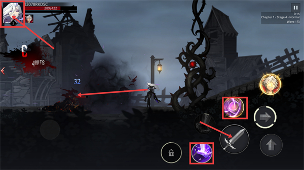 3、切换至【Mirianne】后,战斗积累【C-4HITS】连击,点击【紫色技能按钮】能造成32点伤害,推进当前波次进程。