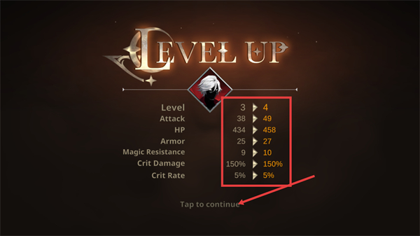 4、触发【LEVEL-UP】后,角色从3级升至4级,属性得到提升,点击【Tap-to-continue】即可继续后续操作。