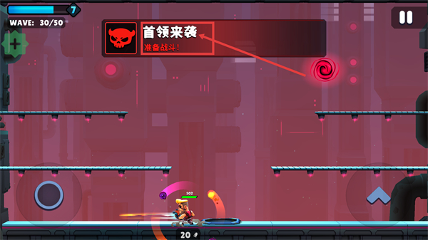 1、处于【WAVE:30/50】时触发【首领来袭-准备战斗!】提示,需利用瞄准与移动按钮,做好应对首领的战斗准备。