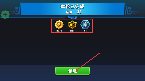 4、本轮完成后在结算界面,点击【领取】获取【金币-x775】【XP-x31】等战利品,用于后续养成。