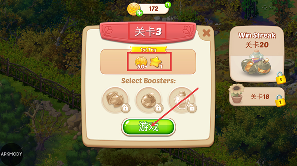 1、在【关卡3】界面,首通【1st-Try】可获【金币-50+】与【星星-1】,点击【游戏】按钮进入该消除关卡。