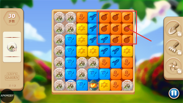 2、进入关卡后,在【30-步数】限制下,消除界面的【橙色炸弹】同色方块,同时可使用【蒲公英-14】道具辅助消除。