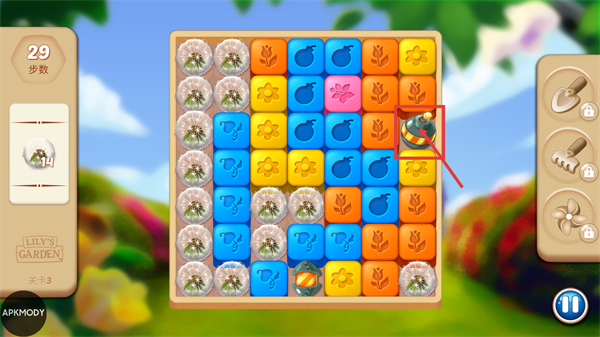 3、步数剩余【29】时,消除方块触发【炸弹道具】,该道具可清除区域内元素,助力更快推进关卡进度。
