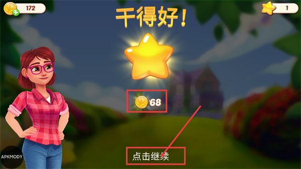 4、完成关卡后出现【干得好!】结算界面,获得【星星】与【金币-68】,点击【点击继续】进入后续内容。
