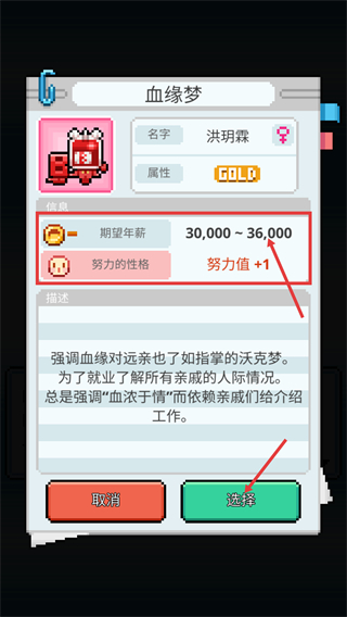 1、在【血缘梦】界面选择【洪玥霖】,其属性为【GOLD】,期望年薪【30,000~36,000】,【努力的性格】可带来努力值+1的加成。
