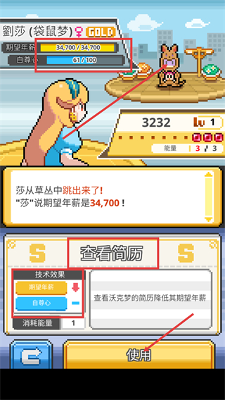 2、遇到【刘莎-(袋鼠梦)】,其期望年薪为【34,700】,使用【查看简历】技能消耗1能量,可降低其期望年薪。