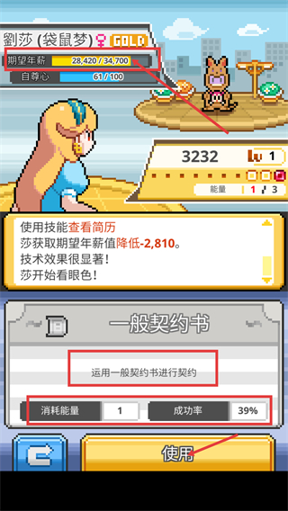 3、使用技能后【刘莎-(袋鼠梦)】期望年薪降至【28,420】,用【一般契约书】消耗1能量,以39%成功率进行契约。
