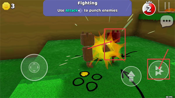 3、进入战斗阶段会显示【Fighting】提示,按右侧星形【Attack】按钮攻击敌人,遵循【Use-Attack-to-punch-enemies】的指引来击败对手。