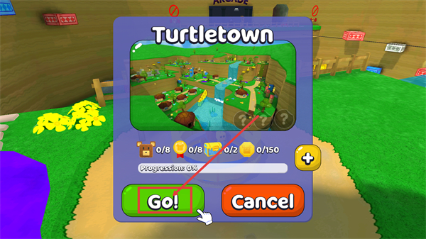 1、进入【Turtletown】区域前,进度为【0%】,收集目标含小熊【0/8】等,点击绿色【Go!】按钮即可开启该区域的探索。
