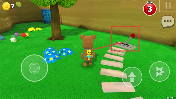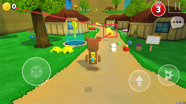 2、处于【Turtletown】场景时,【Life】数值为【3】,操控角色移动收集路径上的黄色道具,同步探索场景互动元素。