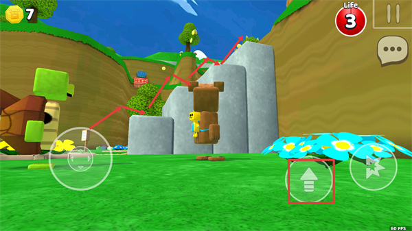 4、跟随箭头指引的路径,点击右侧跳跃按钮操控角色跃过平台,前往高处区域获取收集物并推进关卡进程。
