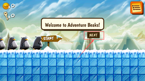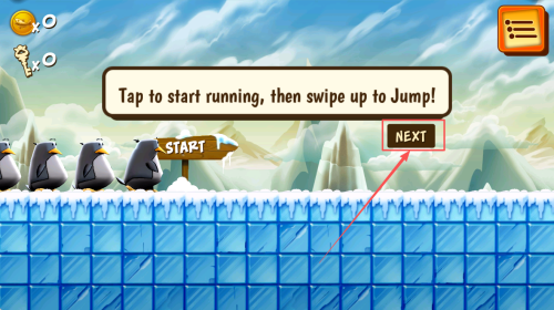 2、学习跳跃:按照提示点击“NEXT”,学习企鹅跳跃的基本操作。