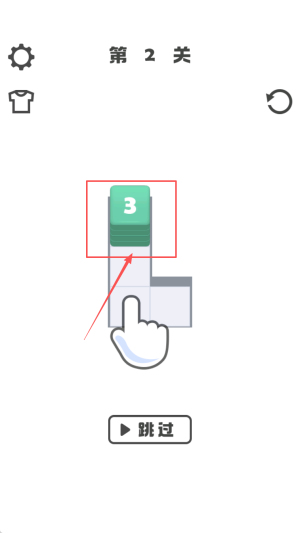 1、进入第1关:屏幕显示“第1关 2 跳过”,点击“跳过”按钮,直接进入下一环节。