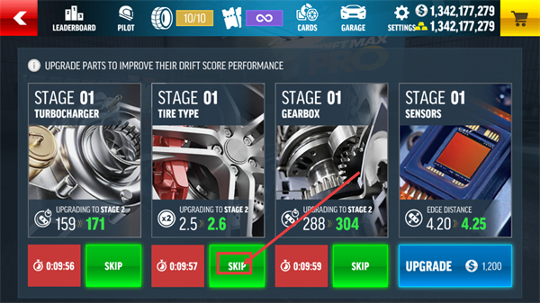 2、在升级界面选择【STAGE-01】类部件,点击对应【UPGRADE】按钮,花费1200金币提升部件的性能属性。