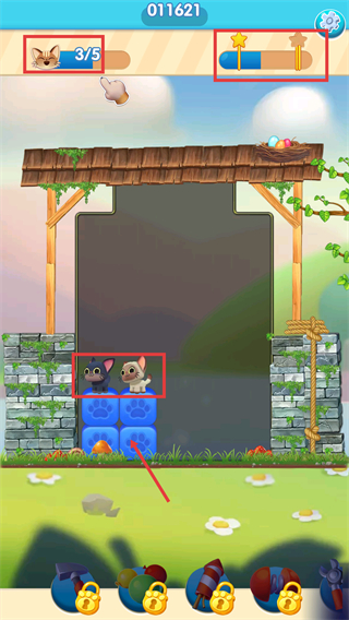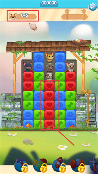 2、关卡内目标为收集【0/5-猫】,跟随界面提示消除对应方块,助力宠物下落,聚焦该收集目标推进当前关卡进度。