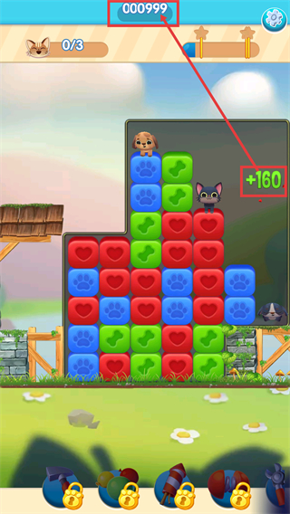 3、当前关卡分数更新至【00099】,同时获得【+160】加分,继续消除方块让宠物下落,以推进收集目标进度。