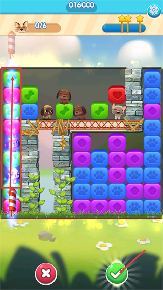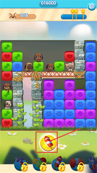 2、本关目标为收集【0/6-猫】,可利用界面中的【火箭道具】消除方块,助力宠物下落,聚焦该收集目标推进当前进度。