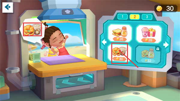 1、在点餐界面选定【牛角包-饮品组合】,该组合对应【30】金币奖励,选定后即可启动该餐食的制作流程。