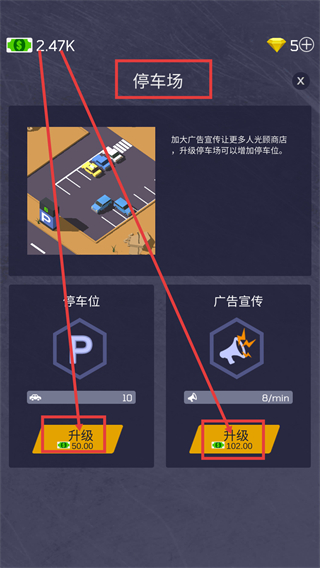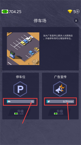 2、进入【停车场】界面,可消耗【50.00】货币升级【停车位】,或用【102.00】升级【广告宣传】,提升店铺客流与接待量。